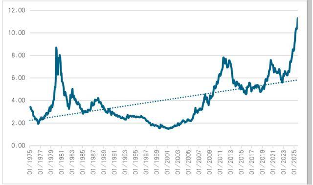 长期以来,黄金价格被认为能够对抗通货膨胀。Erb与Havey(2013)的研究发现,历史上黄金价格与美国定基CPI指数的比率平均为3.2倍,这个比值可以视为反映黄金购买力波动均值的黄金常数,且黄金价格大约在10年左右的时间维度内呈现均值回归的趋势。不过如图1所示,随着2022年之后黄金价格不断创出历史新高,黄金价格与美国定基CPI指数比率的均值不断抬升,目前已经接近6倍左右。值得注意的是,自2010年以来至今,黄金价格与美国定基CPI指数的比率大致已经连续15年高于历史均值,且当前黄金价格与美国定基CPI指数与均值的偏离程度,已经与1980年初的上一次历史高位相仿。换言之,从黄金价格对抗通货膨胀的视角以及均值回归的视角来看,黄金价格回落调整的概率随着时间的推移将会不断上升。